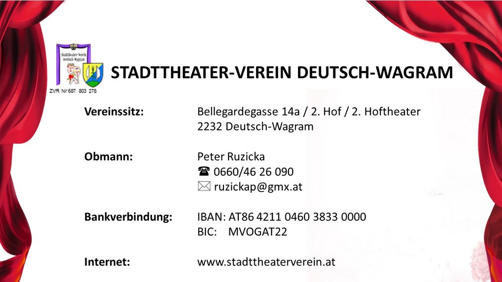 Der Stadttheater-Verein Deutsch-Wagram wurde im Juni 2001 gegründet (ZVR-Zahl: 687803278). Der Vereinssitz ist in 2232 Deutsch-Wagram. Für den weitern Aufbau unseres überparteilichen Theater-Vereins suchen wir Spielbegeisterte und Showtalente jeden Alters, die gerne einen ersten Versuch wagen wollen oder vielleicht auch schon ein wenig Erfahrung haben. Die Proben finden in der Regel jeden Mittwoch um 19:00 Uhr in unserem Vereinslokal in Deutsch-Wagram (Bellegardegasse 14a / 2ter Hof) statt. Einen zugehörigen Stadtplan finden Sie unten.
